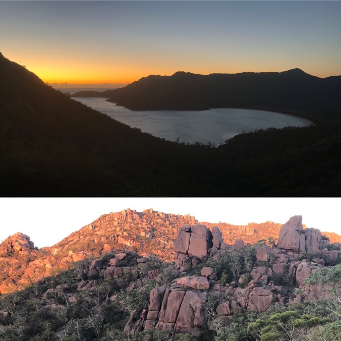 Wineglass Bay and Mount Mayson from Wineglass Bay Lookout At Sunrise