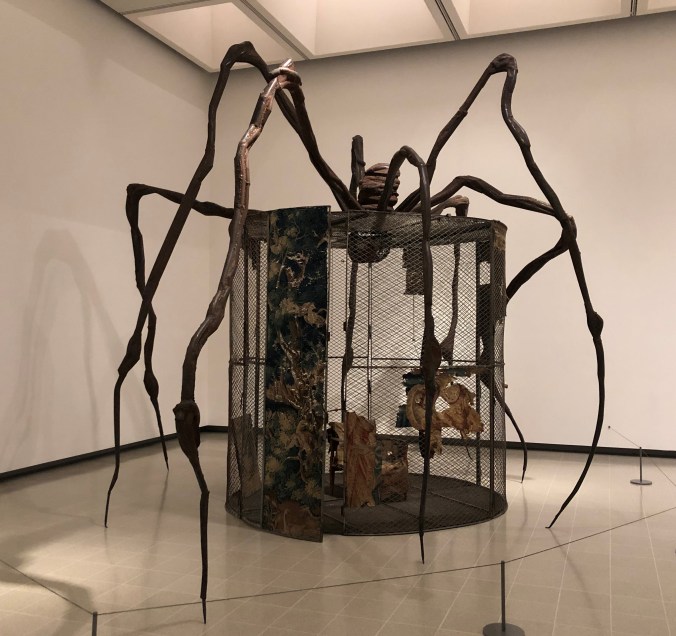 I particularly liked the sets of print and fabric compositions based around spiders’ webs and the concept of spiders as a weaver and repairer of its woven lairs that dominated the second half of the exhibition. The large sculpture of a mother spider, surrounded by a cage and a host of artefacts hinting at threat, protective motherhood and Louise’s own childhood memories, seemed to reflect and oversee a number of other nearby works.  I ended up really enjoying the exhibition and the way it was laid out.