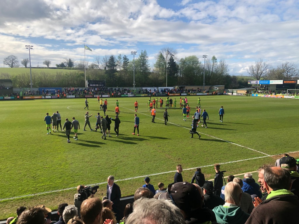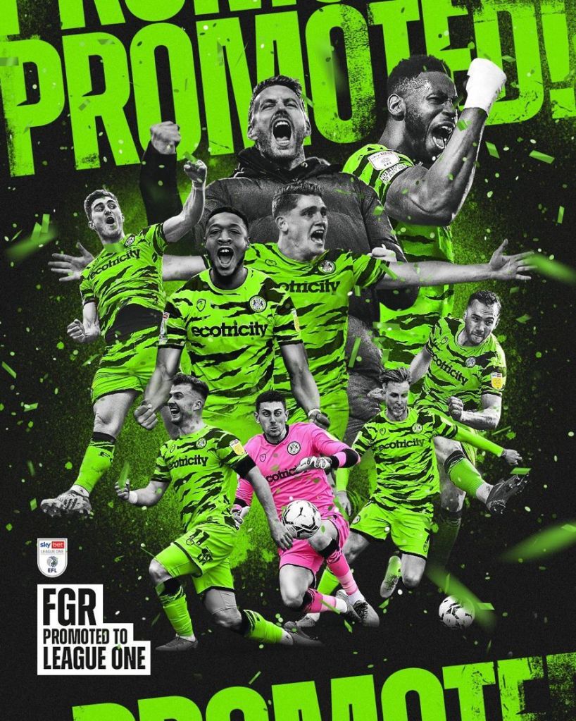 Of course the next highlight was Forest Green Rovers’ game at Mansfield. We needed to achieve a better result on the day than Exeter City (who were playing at home in Exeter) to win the English Football League Division 2 Championship. We came from behind twice against Mansfield with two fine goals right in front of us to gain a draw. Then, a minute after our result, we heard that Exeter had lost; we are Champions! Joy was unconfined on and off the pitch!