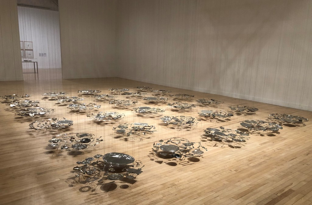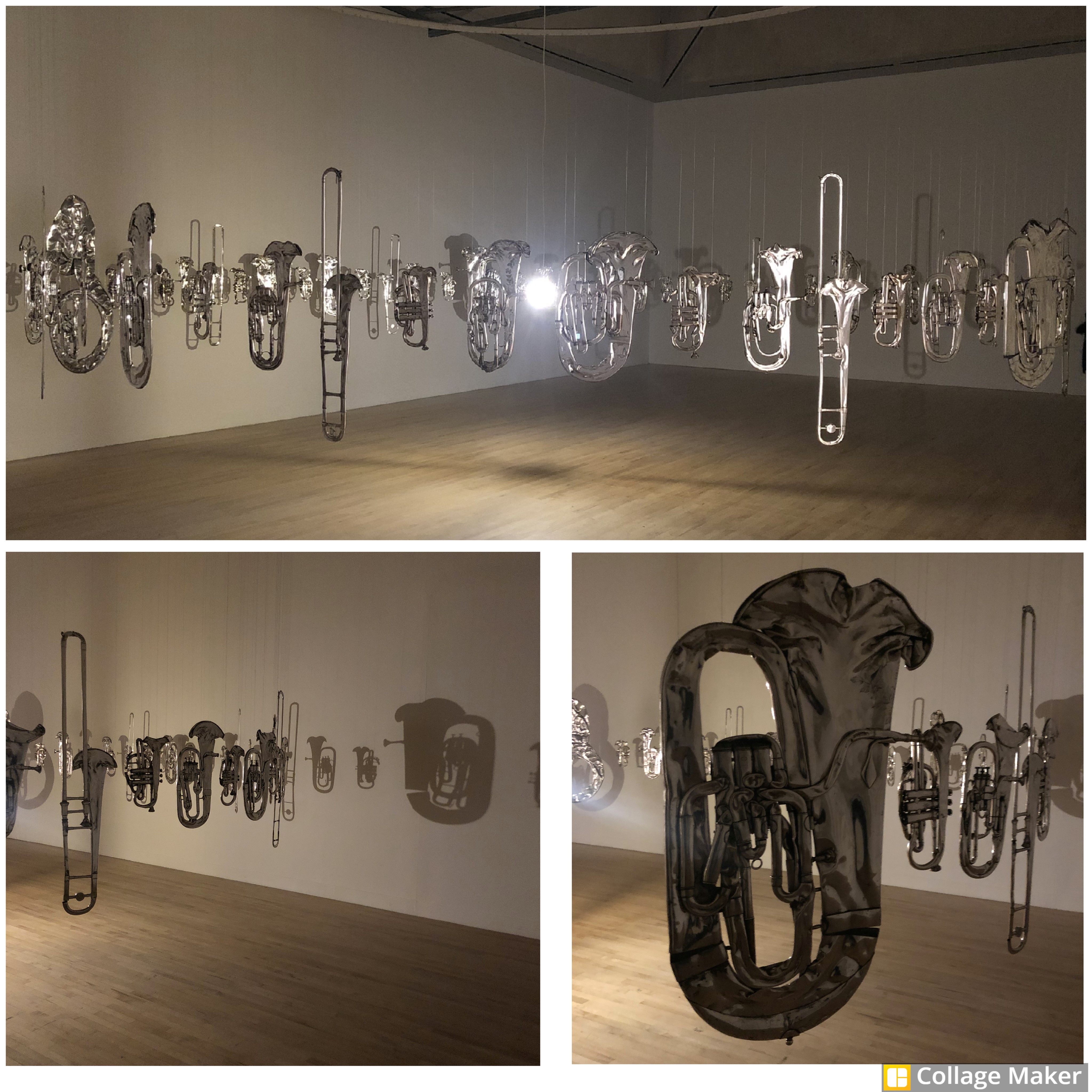 In one room there were a series of suspended pools of crushed silver objects apparently collected from flea markets and then collectively flattened by a steamroller (‘Thirty Pieces of Silver’). Another similar exhibit was of flattened brass instruments hung in a circle like a huge silver mobile (‘Perpetual Canon’).