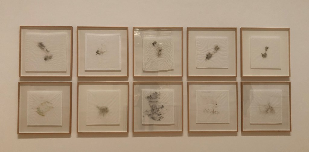 Other works included piles of black lacquer cut from discs to produce vinyl records (‘Negatives of Sound’) and piles of silver left over from engravings (‘Negative of Words’). Another weirdly attractive set of works were cloths stained from rubbing silver spoons belonging to famous/infamous persons such as Davy Crockett and Guy Fawkes (see below).