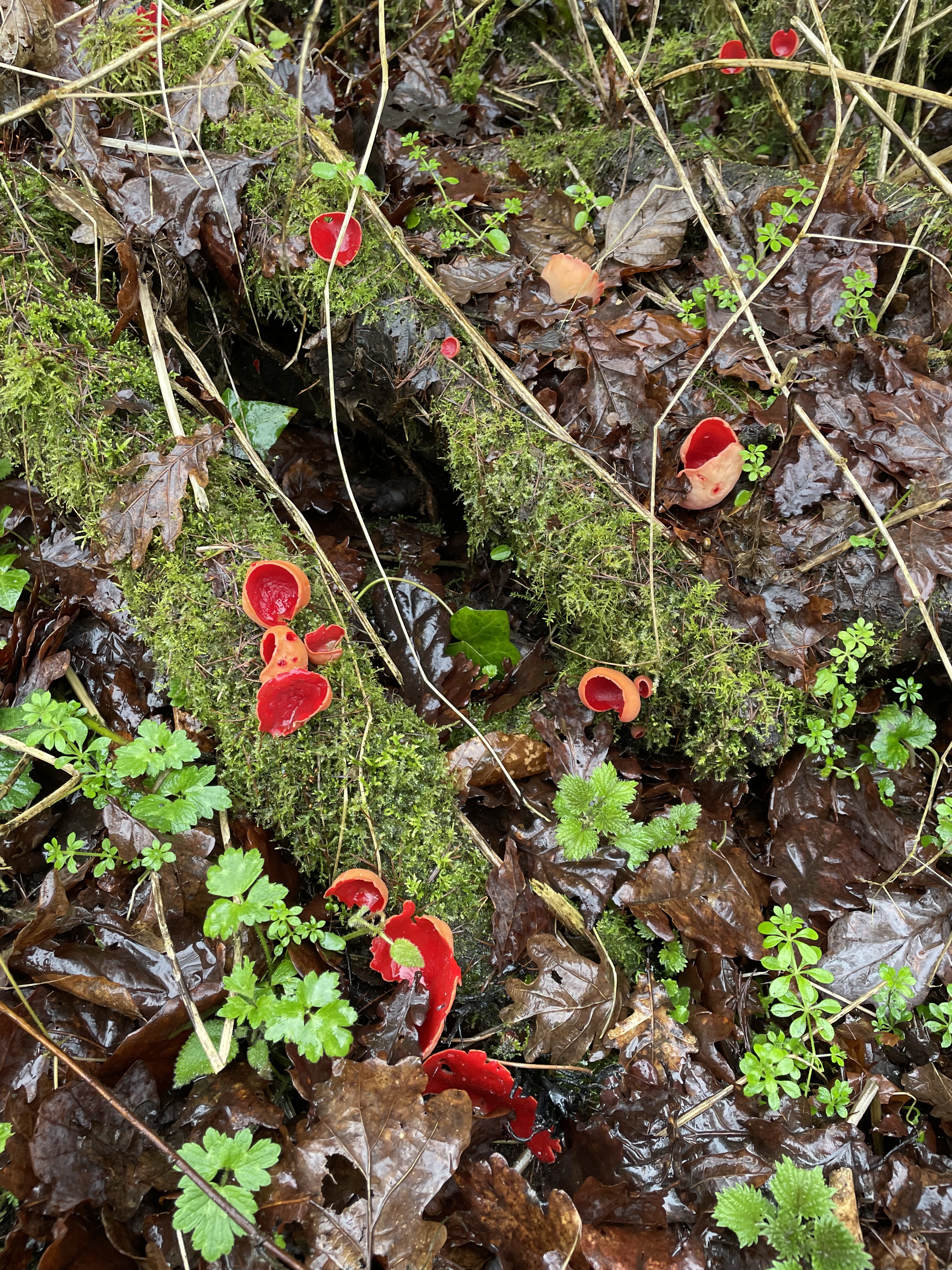 A little earlier this week I saw, for my first time, a myriad of small bright red fungi growing on felled tree trunks and branches and dotted through a few square yards of undergrowth. These are Scarlet Elf Cap fungi. A friend tells me that it is from these little red cups that the wood elves drink the dew to refresh themselves each morning; nice story and a lovely sight.