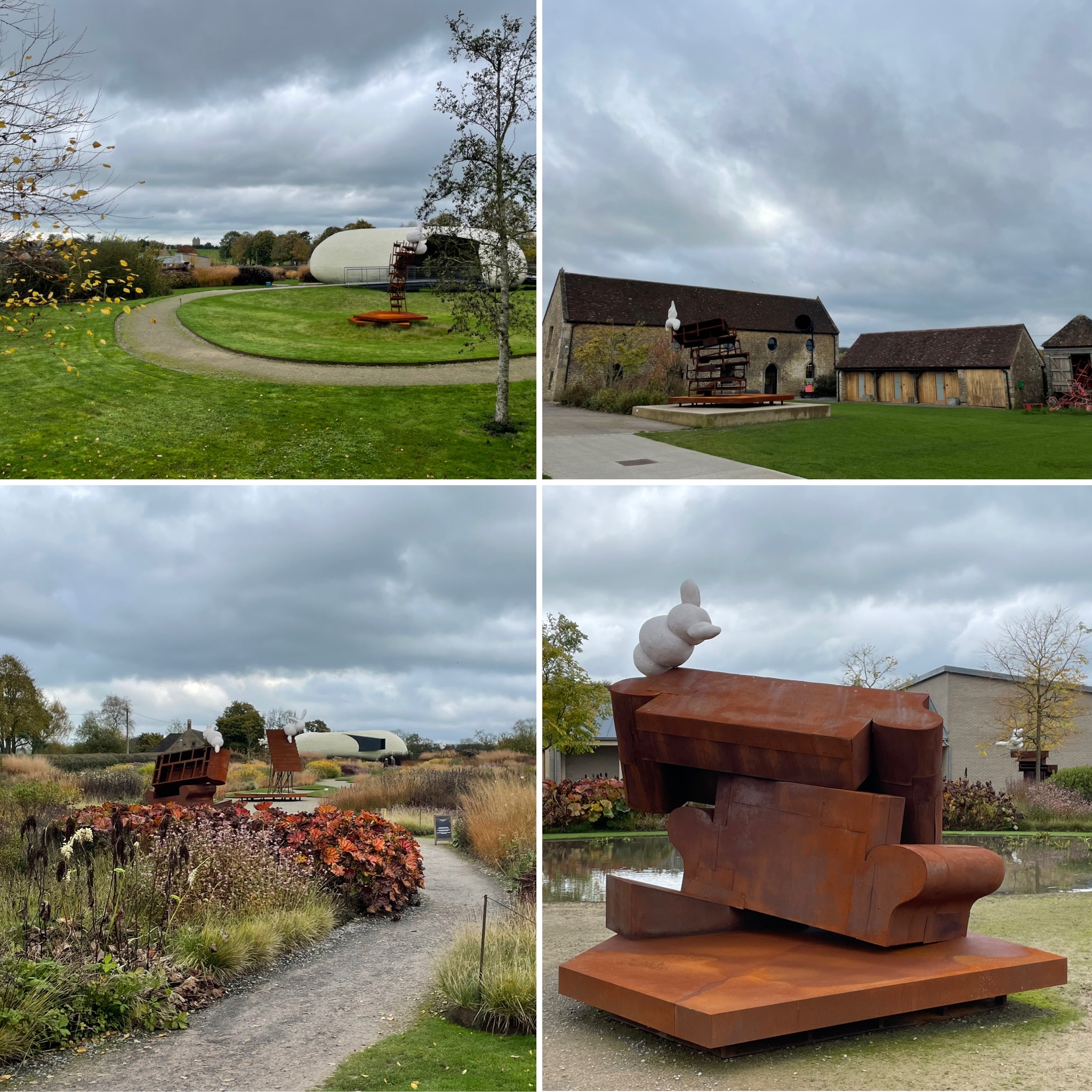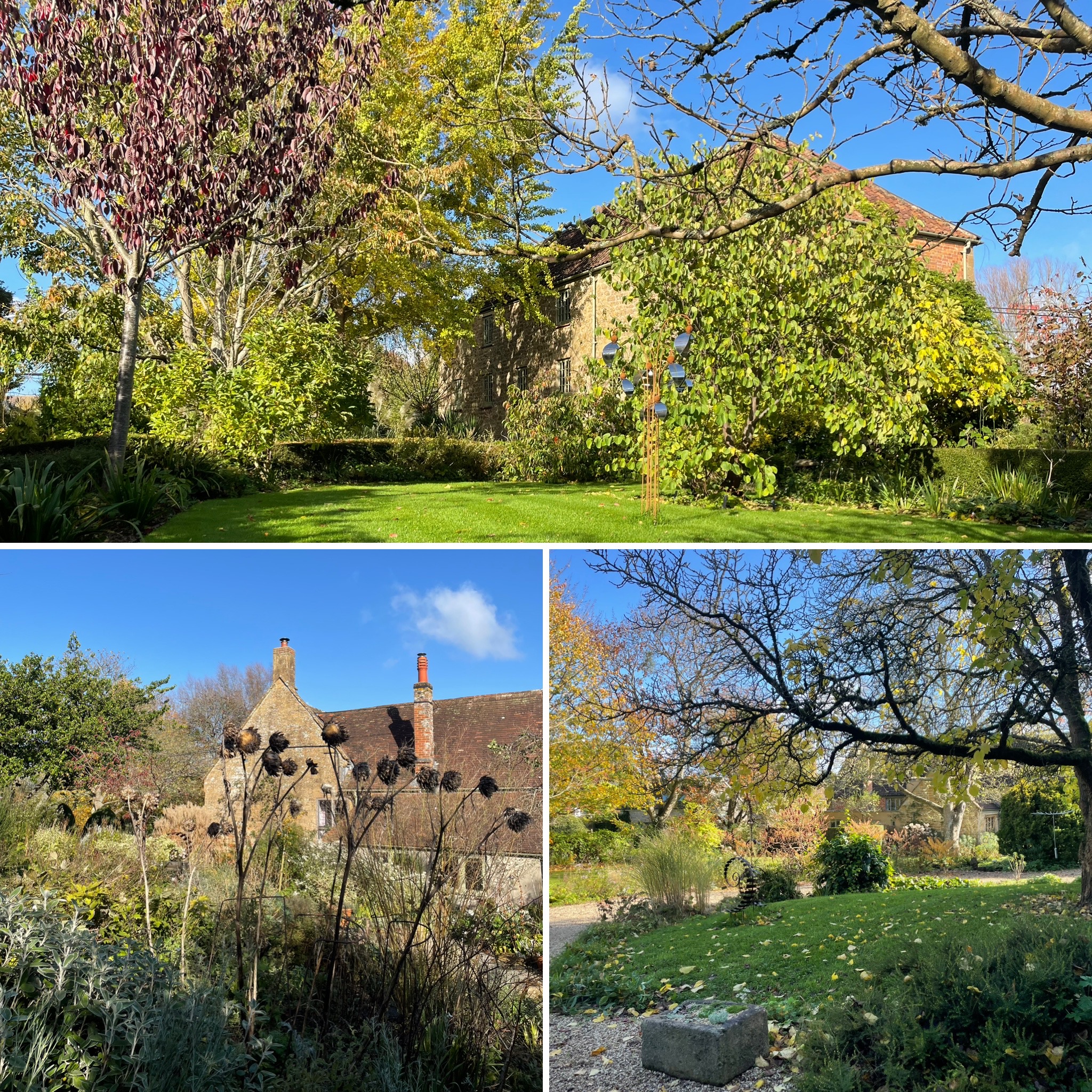 We popped into East Lambrook Manor Gardens which is famous as an archetype cottage garden created by Margery Fish in the second half of the 20th century.  Because of the lateness of the season there was limited colour in the garden.  Even so, the mix of old buildings, autumnal trees, seed heads and densely planted beds were lovely.  All this was augmented by a selection of steel plant-like sculptures by a local artist (Chris Kampf).  We were left wondering how much longer the attractive set-up will last given the ‘For Sale’ sign we saw on the way out – we hope it does as it’s clearly lovingly looked after by the current incumbents and was another little hidden gem for us to see.