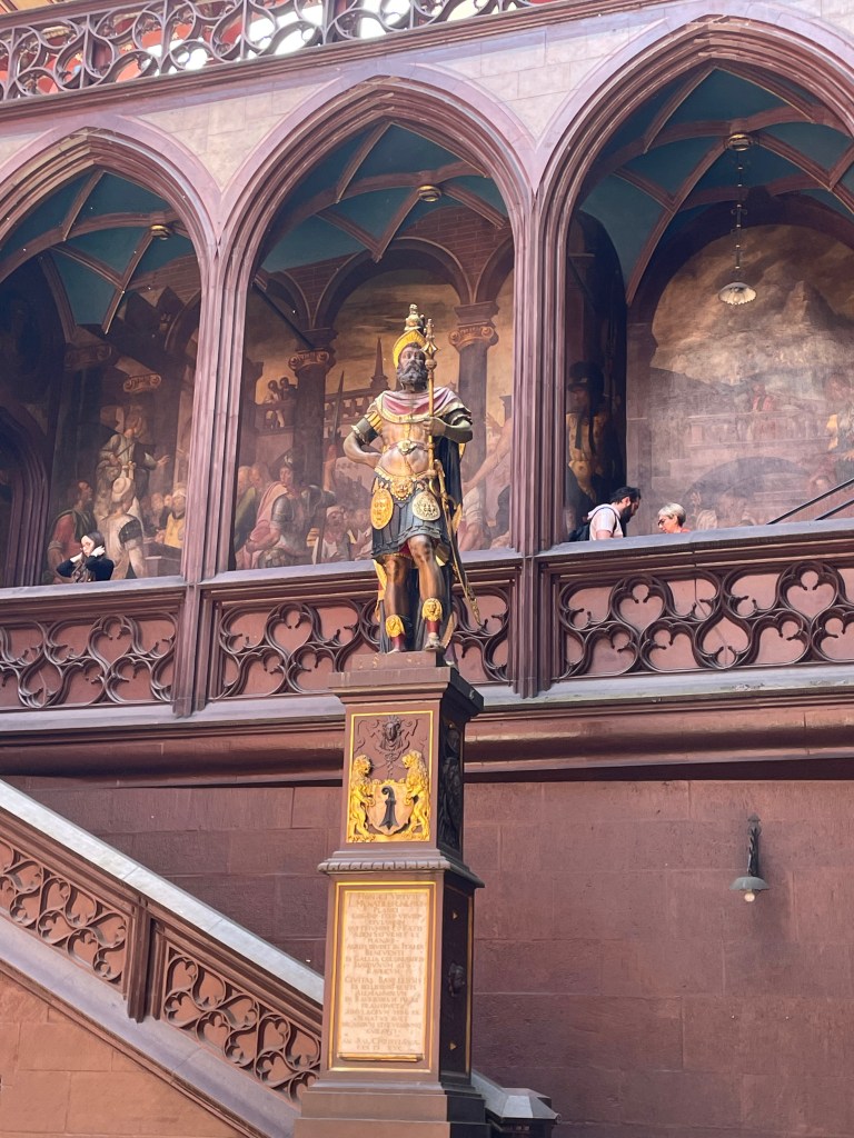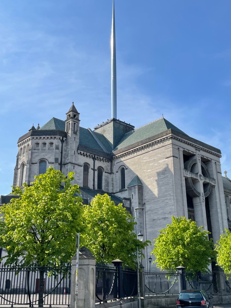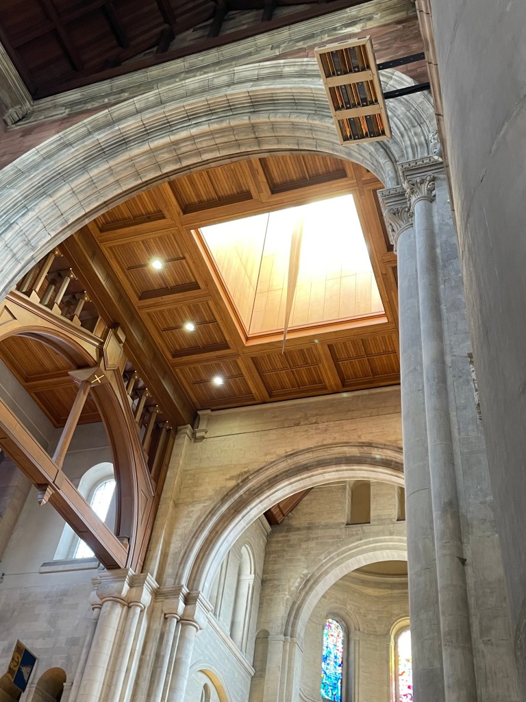 After breakfast at Neighbourhood, Jane went with YS’s wife to her osteopathy studio for a treatment for Jane’s shoulder while YS and I wandered nearby to see The Cathedral Church of St. Anne and some of the local murals. During the several times we have visited this Cathedral Quarter I had not previously noticed the distinctive cathedral spire which was, this time, shining in the sunlight. The way the spire protrudes down into the interior of the church was an interesting bit of design.